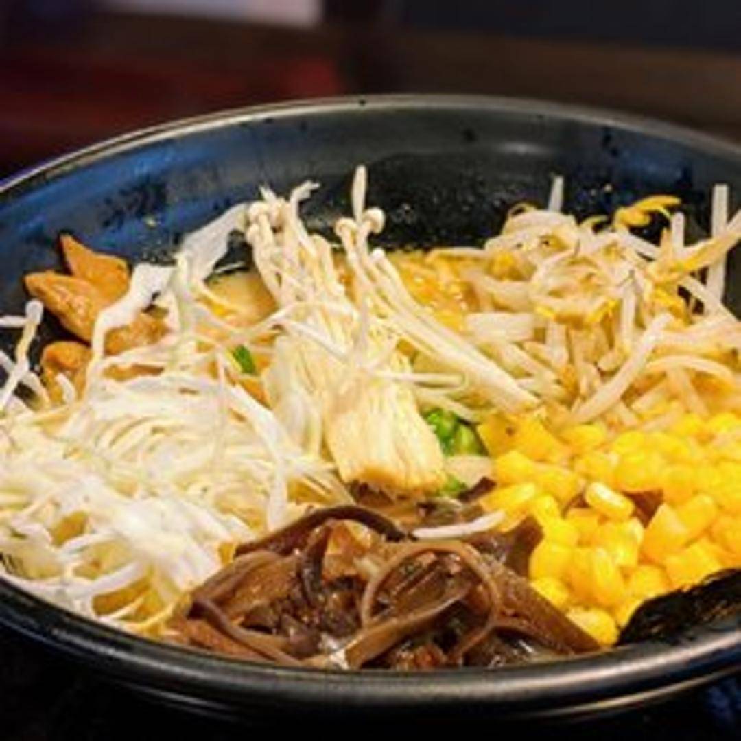 Ramen noodles in a flavorful vegetable broth, topped with a variety of fresh and cooked vegetables, such as mushrooms, bamboo shoots, seaweed, and green onions. May include tofu.