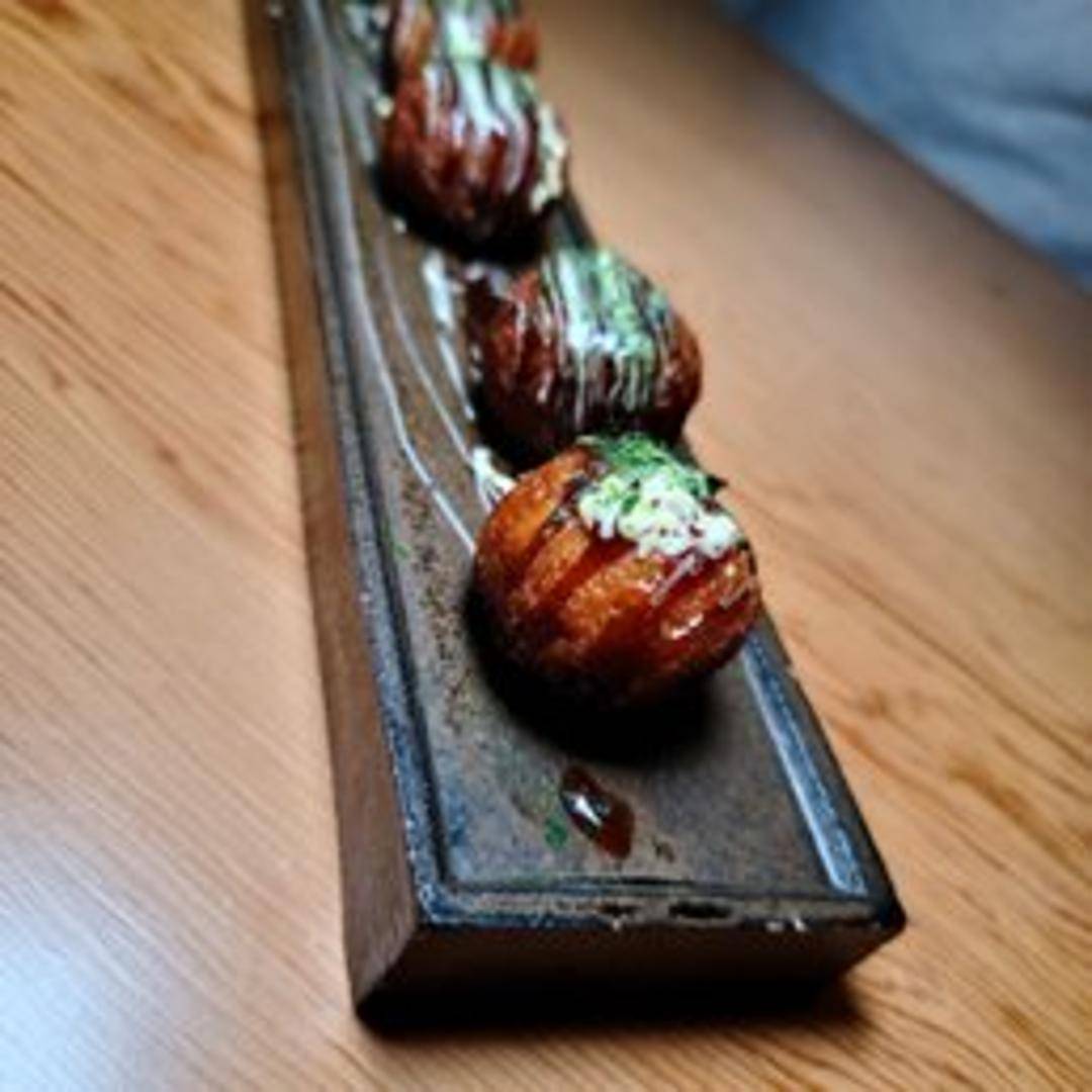 Popular Japanese street food consisting of ball-shaped octopus dumplings. Crispy on the outside and soft on the inside, topped with takoyaki sauce, mayonnaise, dried seaweed flakes (aonori), and shaved bonito flakes (katsuobushi).