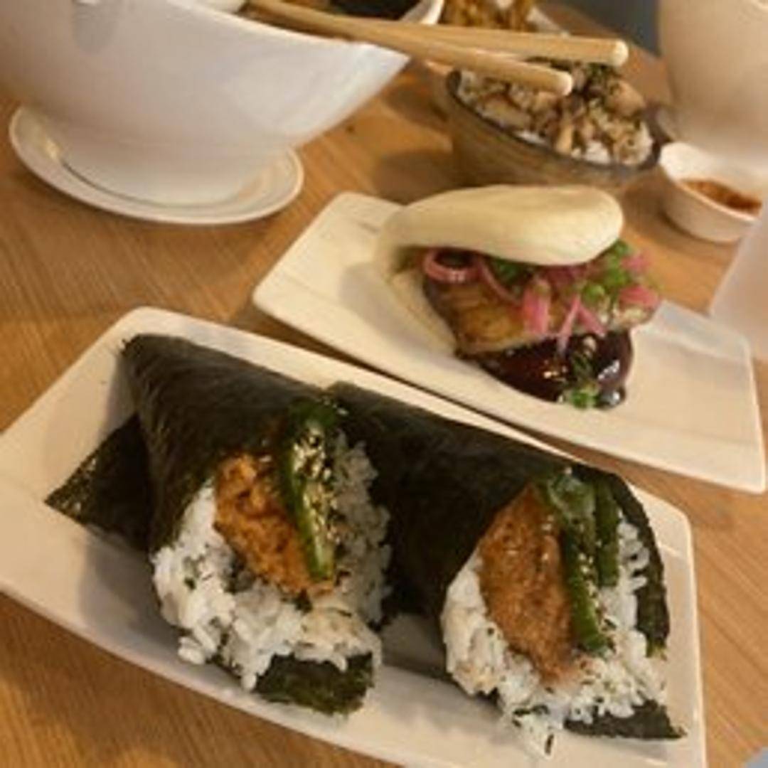 Steamed, fluffy buns filled with tender slices of chashu pork, pickled vegetables, and a sweet and savory sauce.
