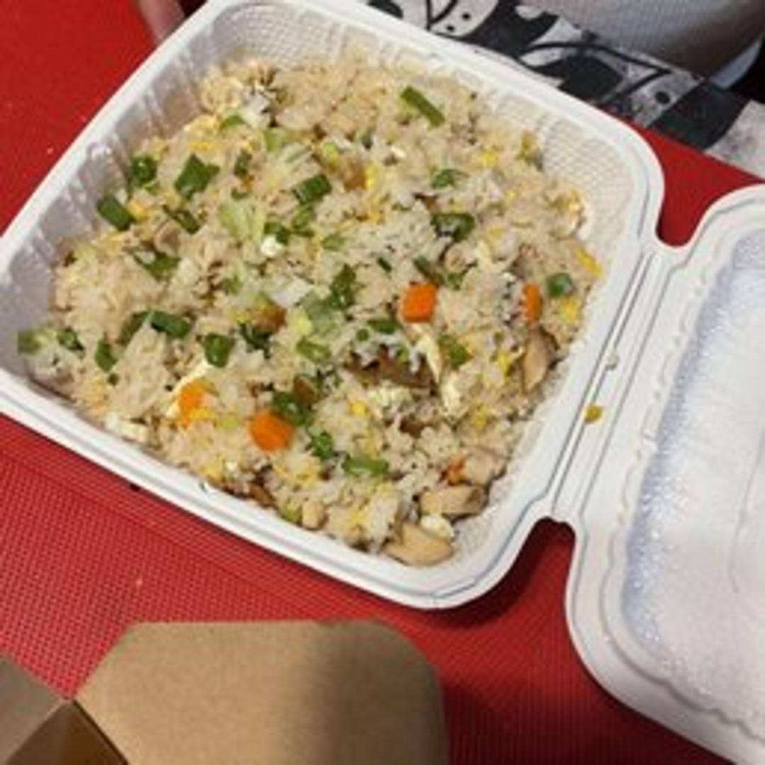 Savory fried rice featuring tender pieces of chicken, fluffy rice, mixed vegetables (peas, carrots, corn), scrambled egg, and seasoned with soy sauce and other umami-rich flavors. A classic comfort food offering a satisfying and balanced meal.
