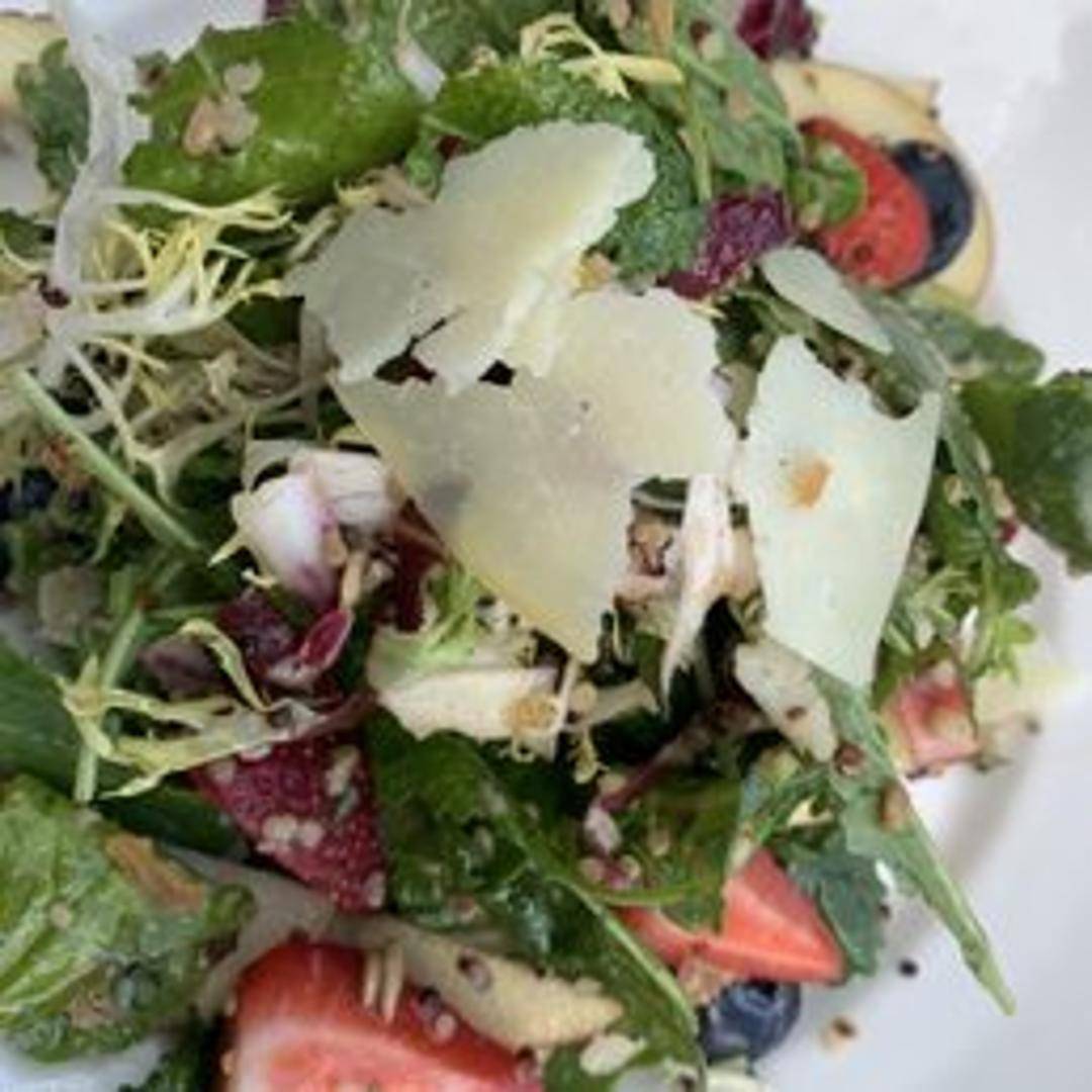 A vibrant and refreshing salad featuring tender baby kale leaves, tossed with crisp cucumber, cherry tomatoes, and a light, zesty vinaigrette, offering a delightful balance of flavors.
