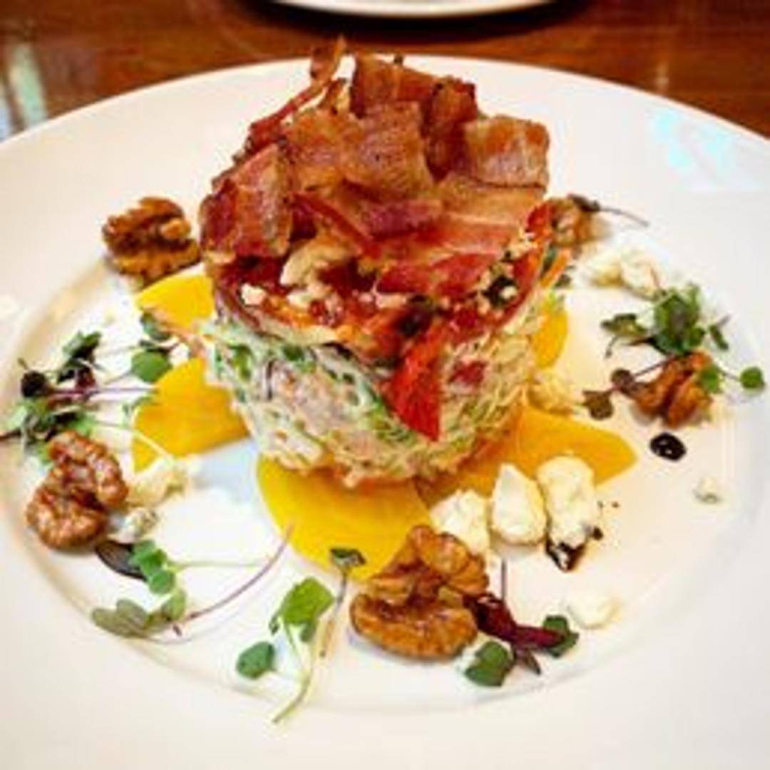 A deconstructed classic featuring crisp, hand-chopped romaine lettuce, sun-ripened cherry tomatoes, and smoky, thick-cut bacon, tossed with a creamy, house-made dressing for a refreshing and satisfying experience.