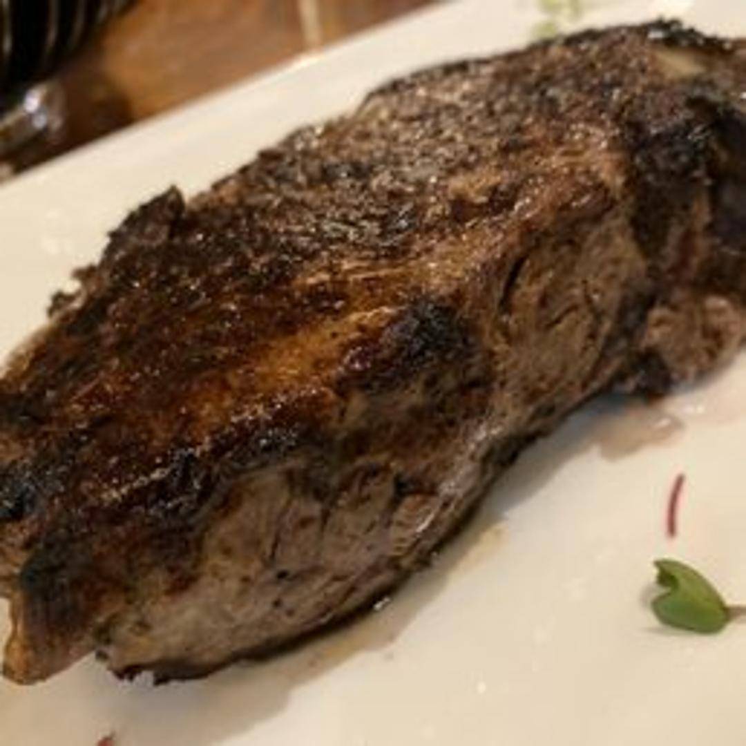 A robust 14oz USDA Prime New York Strip, expertly grilled to showcase its exceptional marbling, firm texture, and deep, beefy flavor, a classic steakhouse favorite.