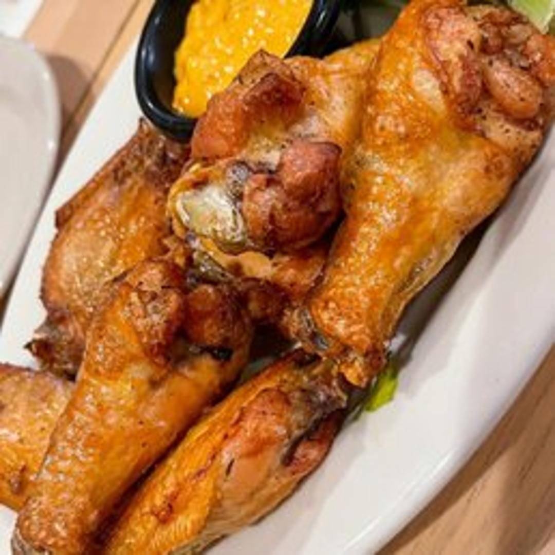 Slow-smoked chicken wings with a rich, smoky flavor. Served with your choice of dipping sauce (Ranch or Blue Cheese) and celery sticks. Options include a variety of sauces. Please specify your sauce choice when ordering.