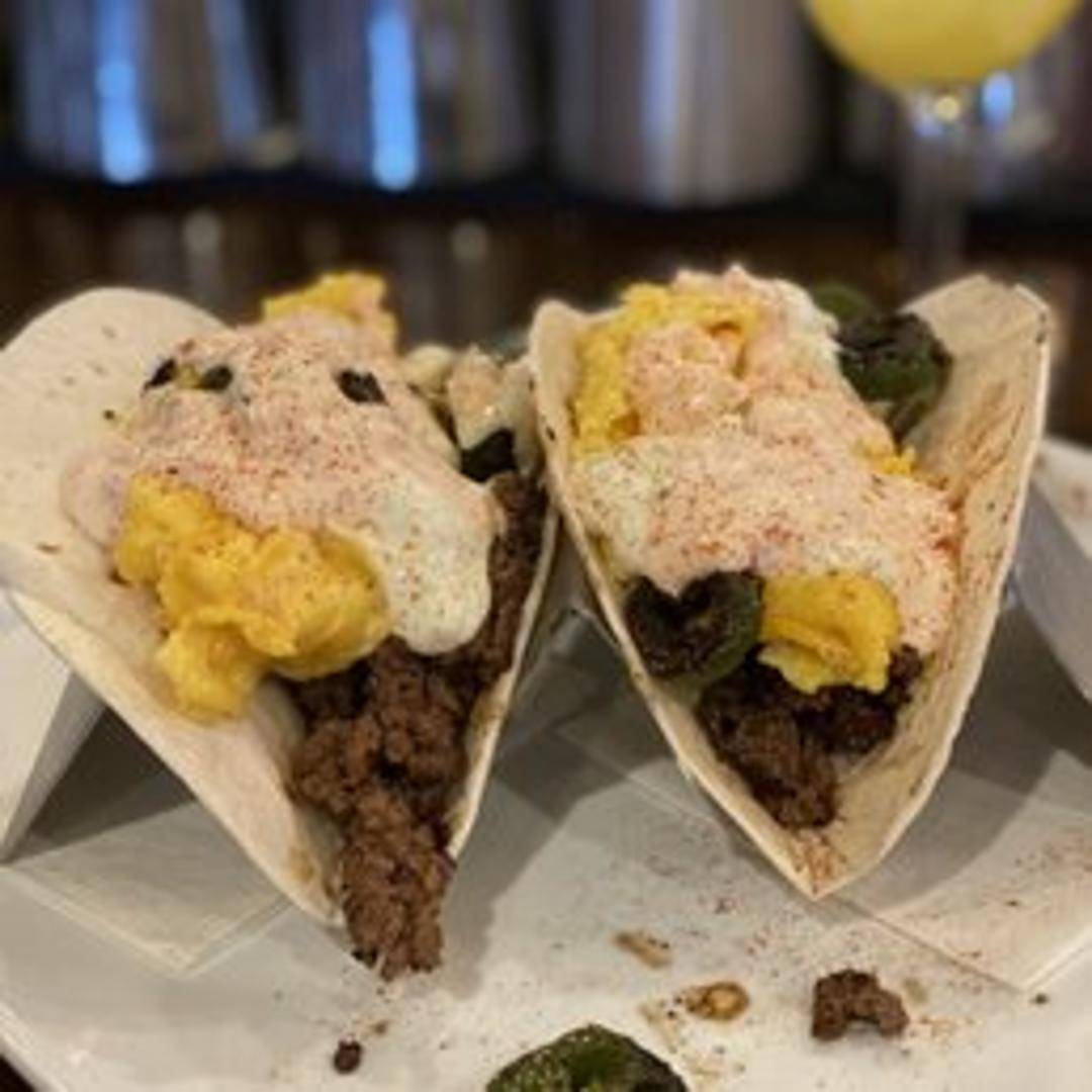 A delightful morning twist on a classic. Enjoy two warm corn tortillas filled with fluffy scrambled eggs, melted Monterey Jack cheese, and your choice of crispy bacon or seasoned sausage. Garnished with fresh pico de gallo and a drizzle of creamy cilantro-lime crema for a burst of flavor.