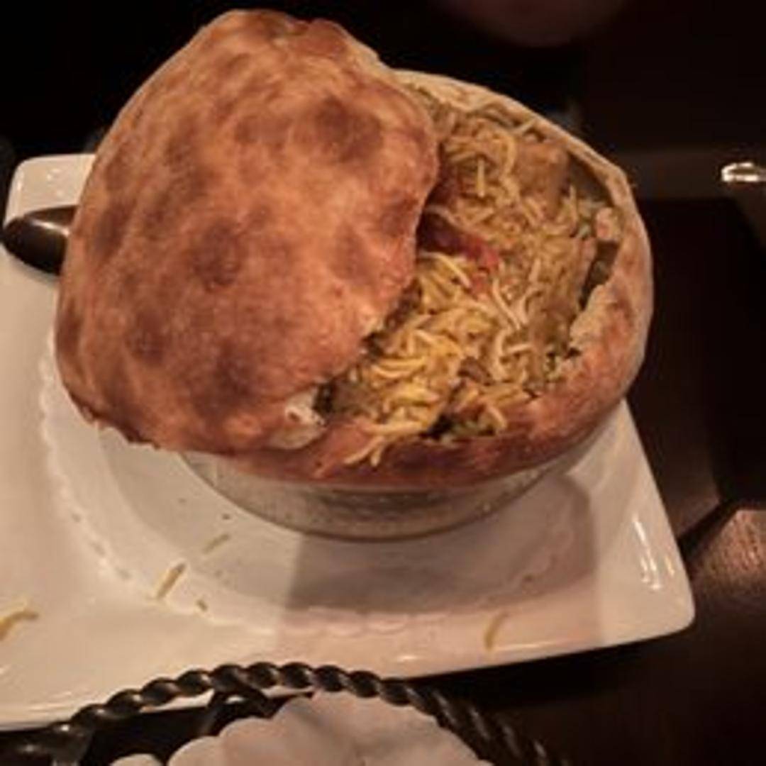 A fragrant and hearty rice dish featuring layers of tender, spiced chicken pieces and long-grain basmati rice, slow-cooked to meld the rich flavors. Infused with aromatic whole spices, herbs, and saffron, this traditional preparation offers a symphony of tastes and textures in every bite.