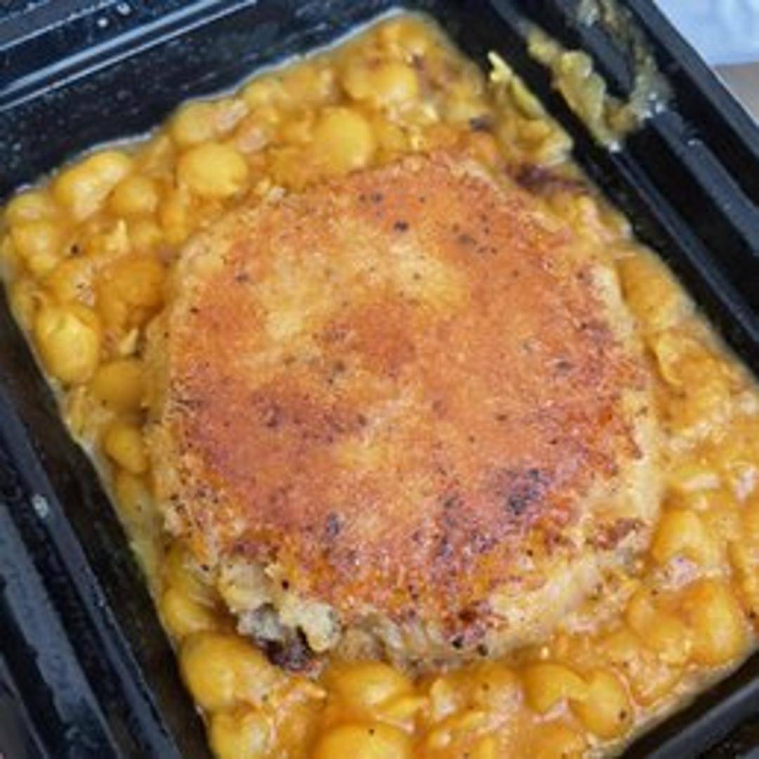 A beloved street food classic, this dish combines two crispy, spiced potato patties (aloo tikki) served atop a hearty and flavorful white pea curry (ragda). The ensemble is typically adorned with a drizzle of sweet and tangy tamarind chutney, a spicy green chutney, fresh chopped onions, and cilantro, creating a comforting and robust culinary experience.