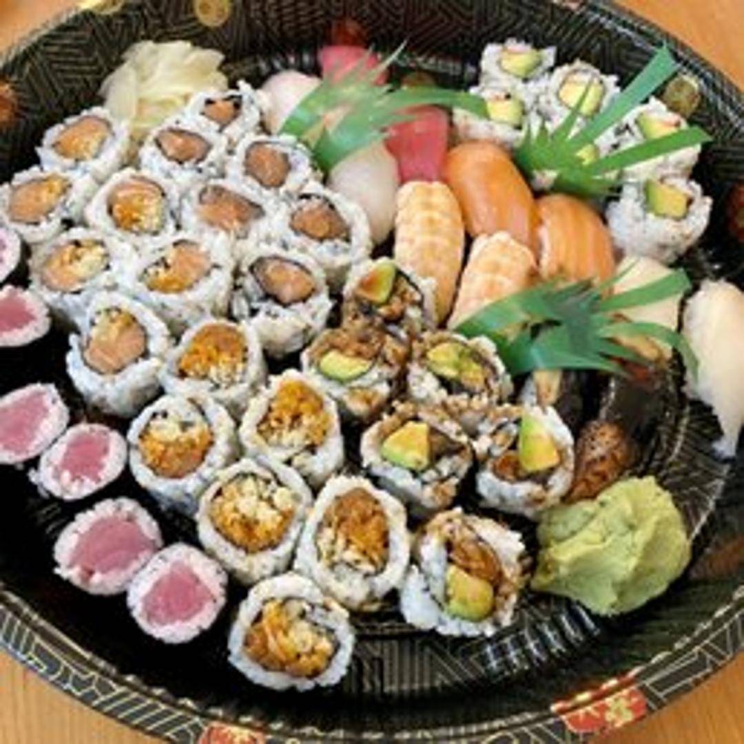 A diverse and meticulously arranged selection of RAWR Sushi's finest sushi and sashimi, ideal for sharing or for those who wish to sample a variety of offerings. This platter typically includes a thoughtful assortment of nigiri, maki rolls, and potentially sashimi, showcasing a range of fresh seafood and culinary expertise.