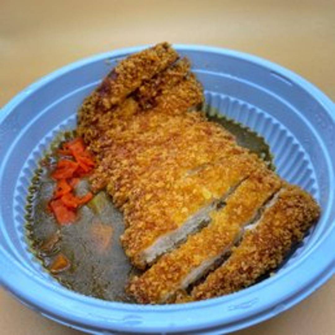 A hearty and comforting Japanese dish featuring a crispy, deep-fried panko-breaded pork cutlet (tonkatsu) served alongside fluffy white rice. The entire dish is generously smothered in a rich, savory Japanese-style curry sauce, creating a satisfying and flavorful meal.