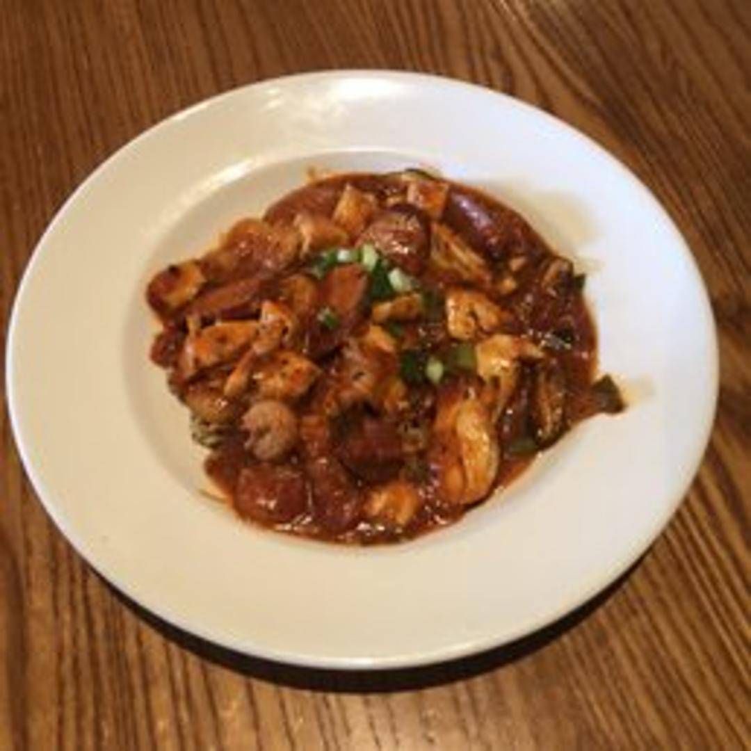 A flavorful Creole rice dish featuring a medley of shrimp, chicken, and andouille sausage, simmered in a spiced tomato broth with peppers, onions, and celery.