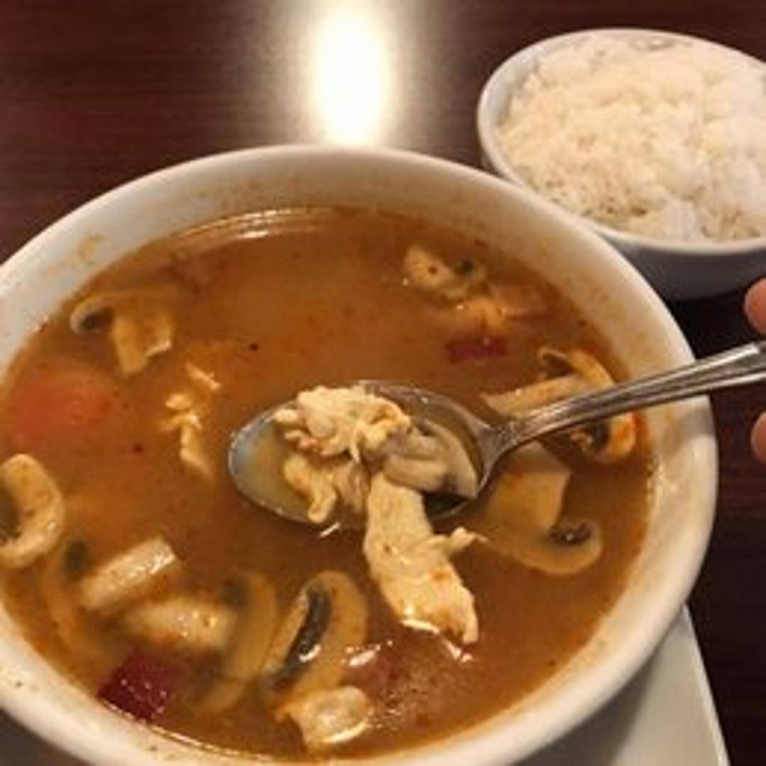 A hot and sour soup with lemongrass, galangal, kaffir lime leaves, mushrooms, tomatoes, chili, lime juice, and your choice of protein.