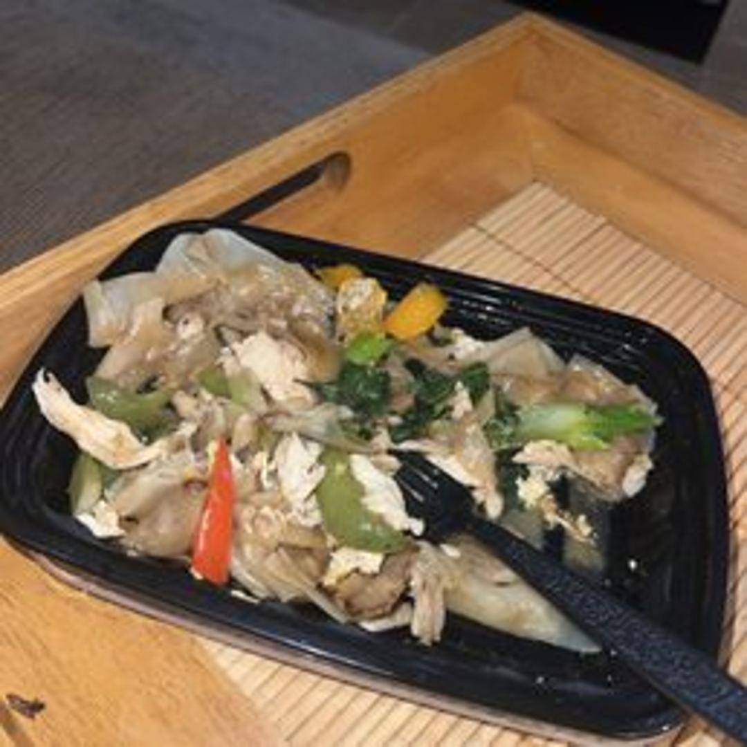 Stir-fried wide rice noodles with chili, garlic, basil, vegetables, and your choice of protein in a flavorful sauce.