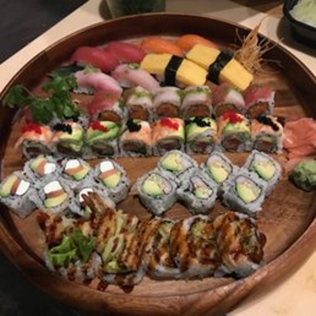 A sushi roll featuring shrimp tempura, crab, avocado, and cucumber, topped with spicy mayo and eel sauce.