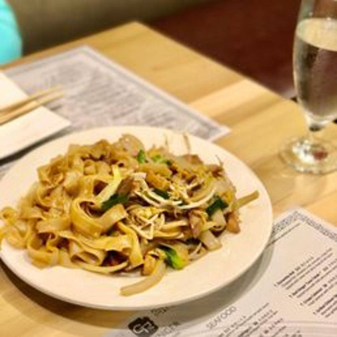 Wide, flat rice noodles stir-fried with your choice of protein (chicken, beef, or tofu), crisp vegetables like bean sprouts and scallions, and a savory soy-based sauce. A satisfying and flavorful noodle dish.