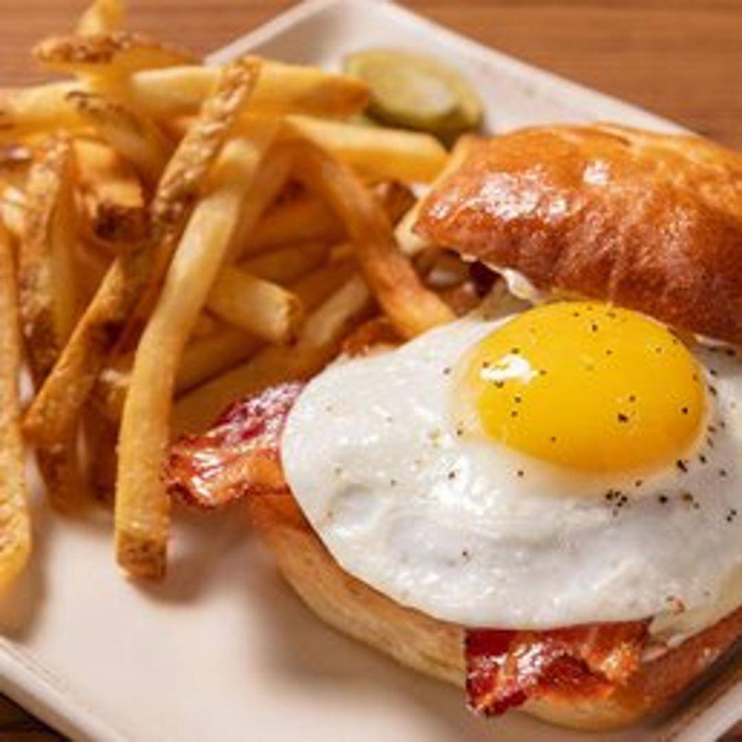A juicy burger patty topped with cheddar cheese, bacon, lettuce, tomato, and a fried egg on a toasted bun. Served with a side of your choice.
