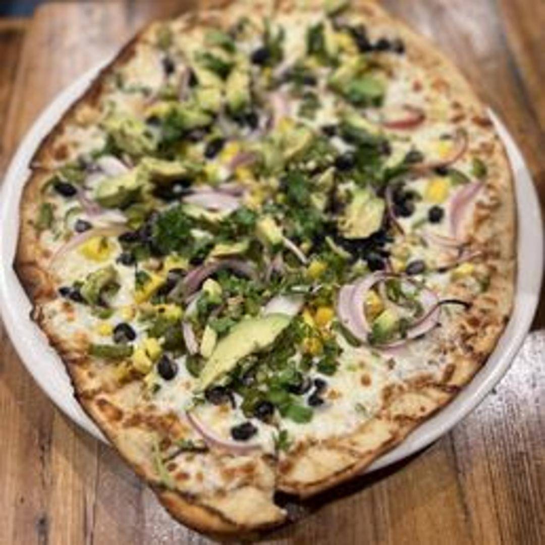 A fusion-inspired pizza featuring Mexican flavors. Expect a crispy base topped with vegetarian refried beans, salsa, melted vegan cheese, diced tomatoes, olives, and a sprinkle of cilantro. Often includes a drizzle of vegan sour cream or guacamole for added richness.