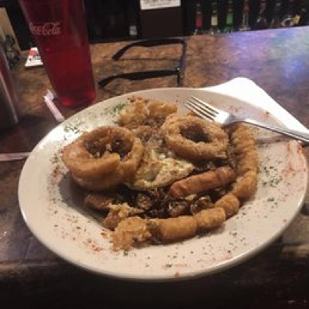 A traditional English dish made with leftover cooked potatoes and vegetables, typically cabbage and other greens, fried together until browned and crispy. May contain other vegetables like carrots, peas, or Brussels sprouts. Seasoned and served hot.
