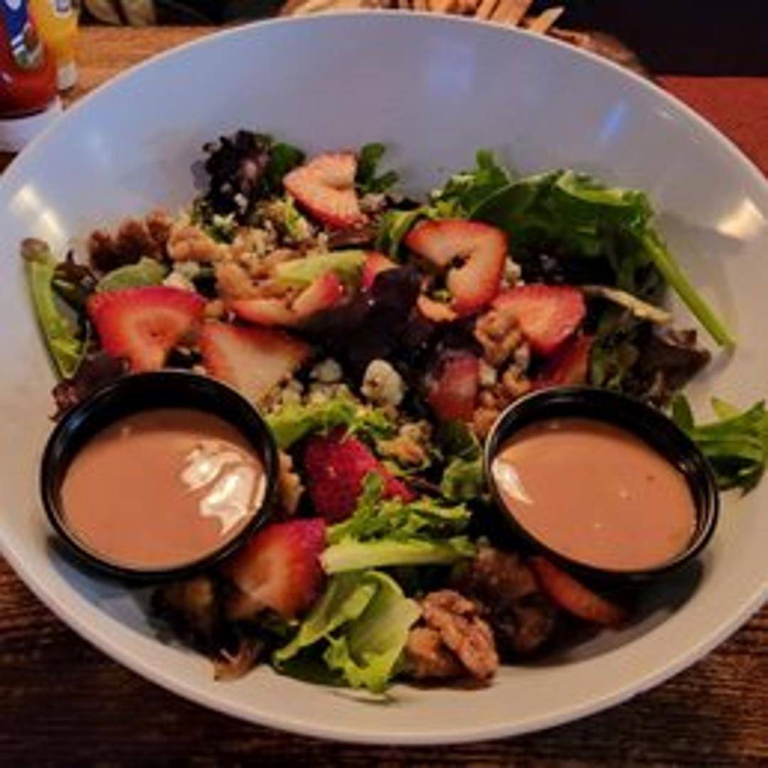 Fresh mixed greens topped with juicy strawberries, crumbled goat cheese, and sweet candied walnuts. Served with a balsamic vinaigrette.