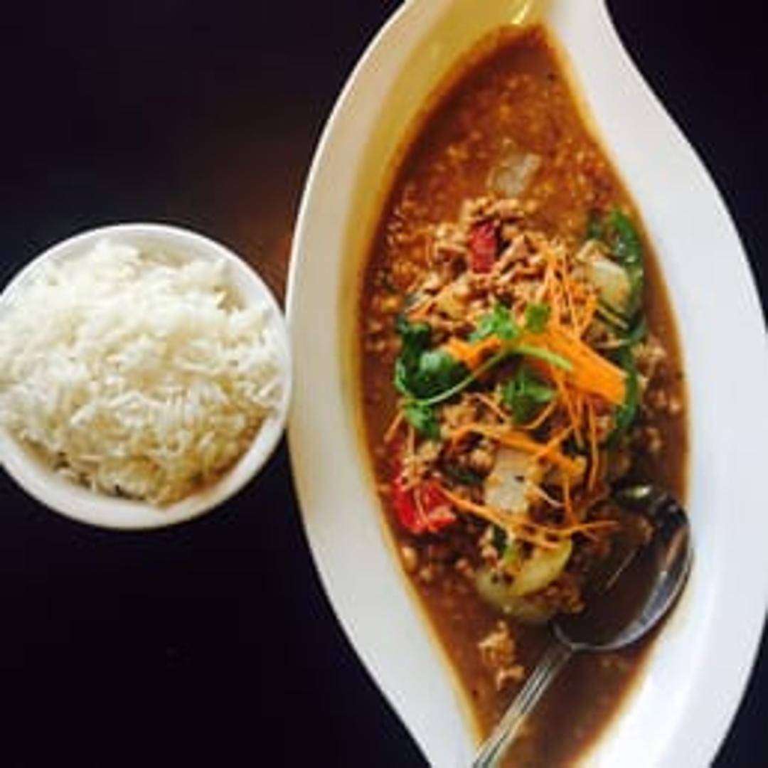 Stir-fried ground chicken with fresh basil leaves, garlic, onions, bell peppers, and chili peppers in a savory and spicy sauce. Served with a side of steamed jasmine rice and a fried egg.
