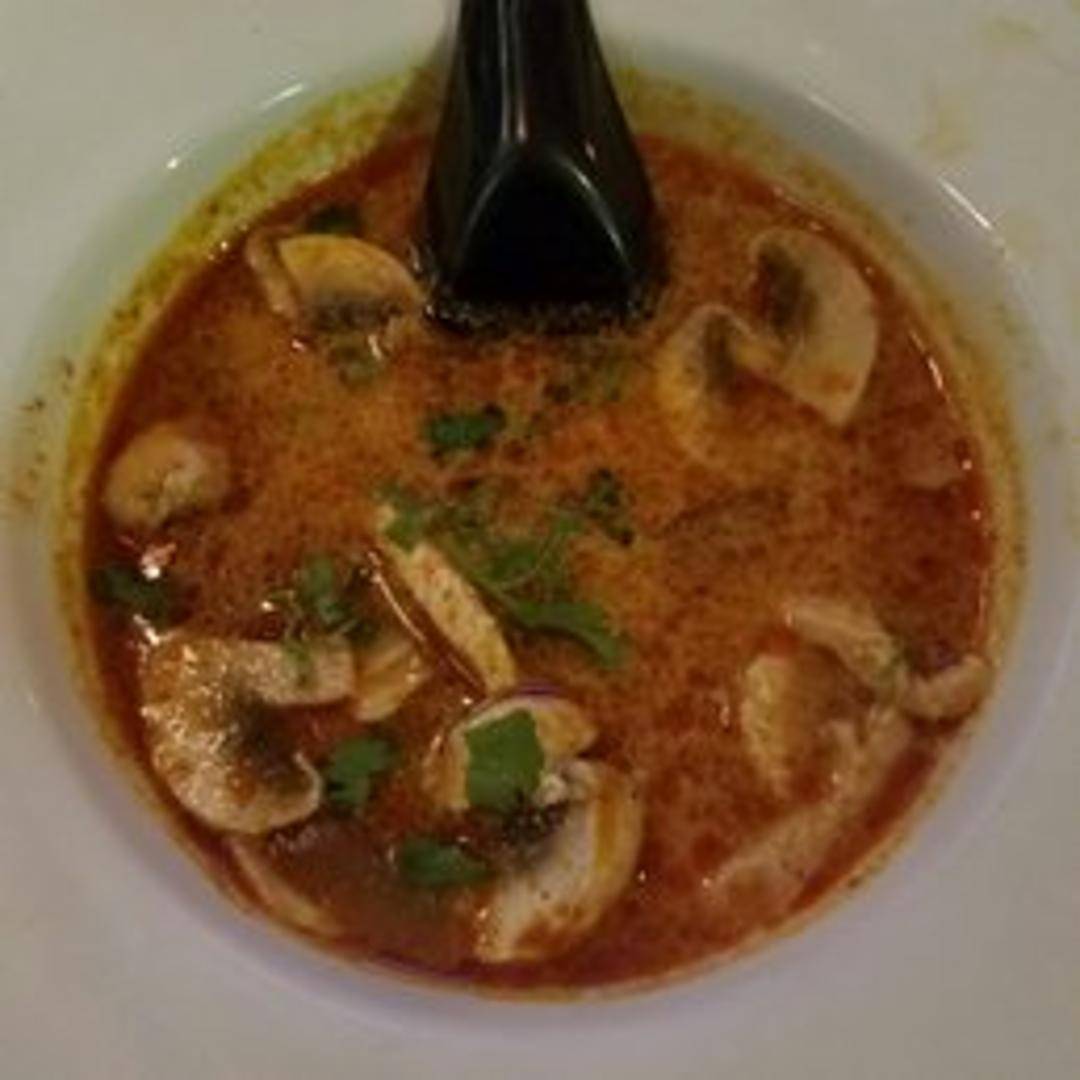 A hot and sour Thai soup with lemongrass, galangal, kaffir lime leaves, mushrooms, tomatoes, onions, and your choice of protein in a flavorful broth. Garnished with cilantro.
