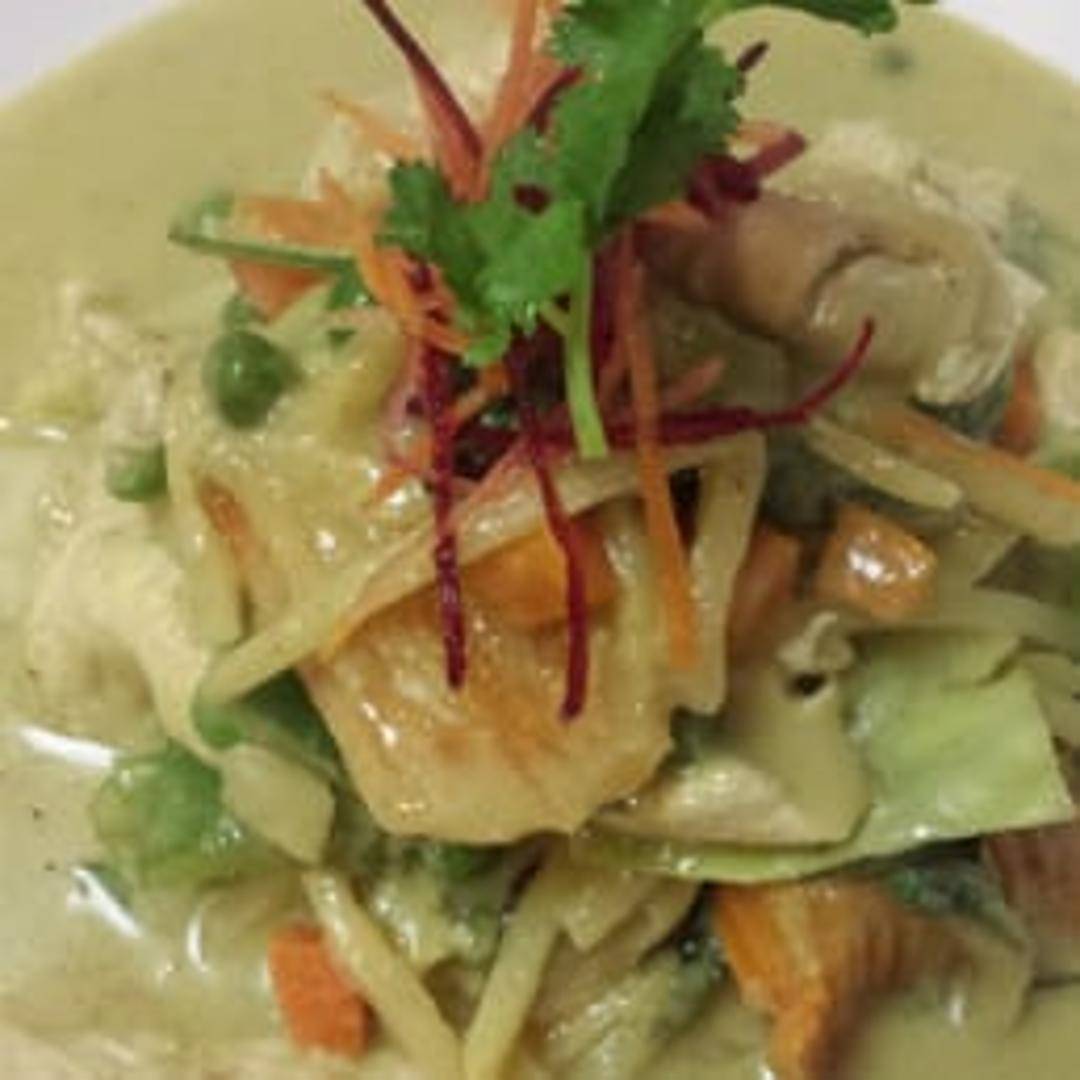 Shrimp simmered in a vibrant green curry sauce made with coconut milk, green chilies, bamboo shoots, bell peppers, eggplant, and basil. Served with a side of steamed jasmine rice.