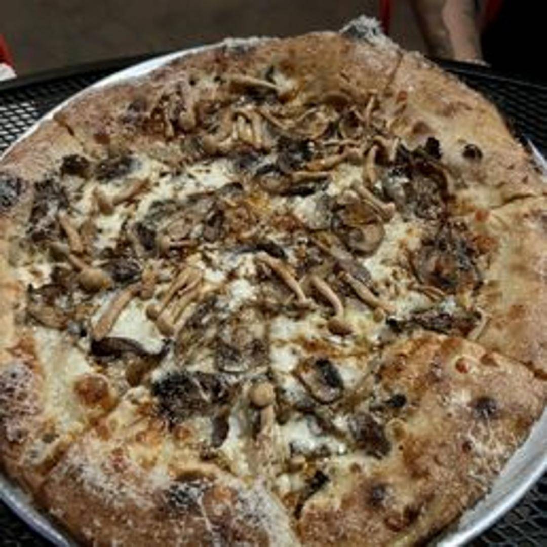 A pizza topped with a variety of sauteed mushrooms, mozzarella cheese, and a sauce base (typically tomato or white sauce). Specific mushrooms may vary.