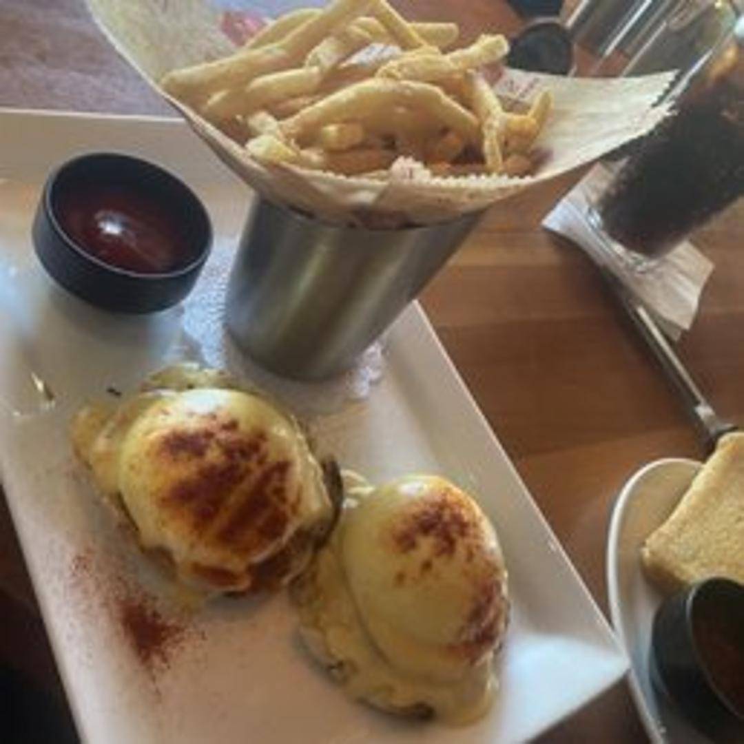 Toasted English muffins topped with Canadian bacon, poached eggs, and classic hollandaise sauce. Served with choice of side.