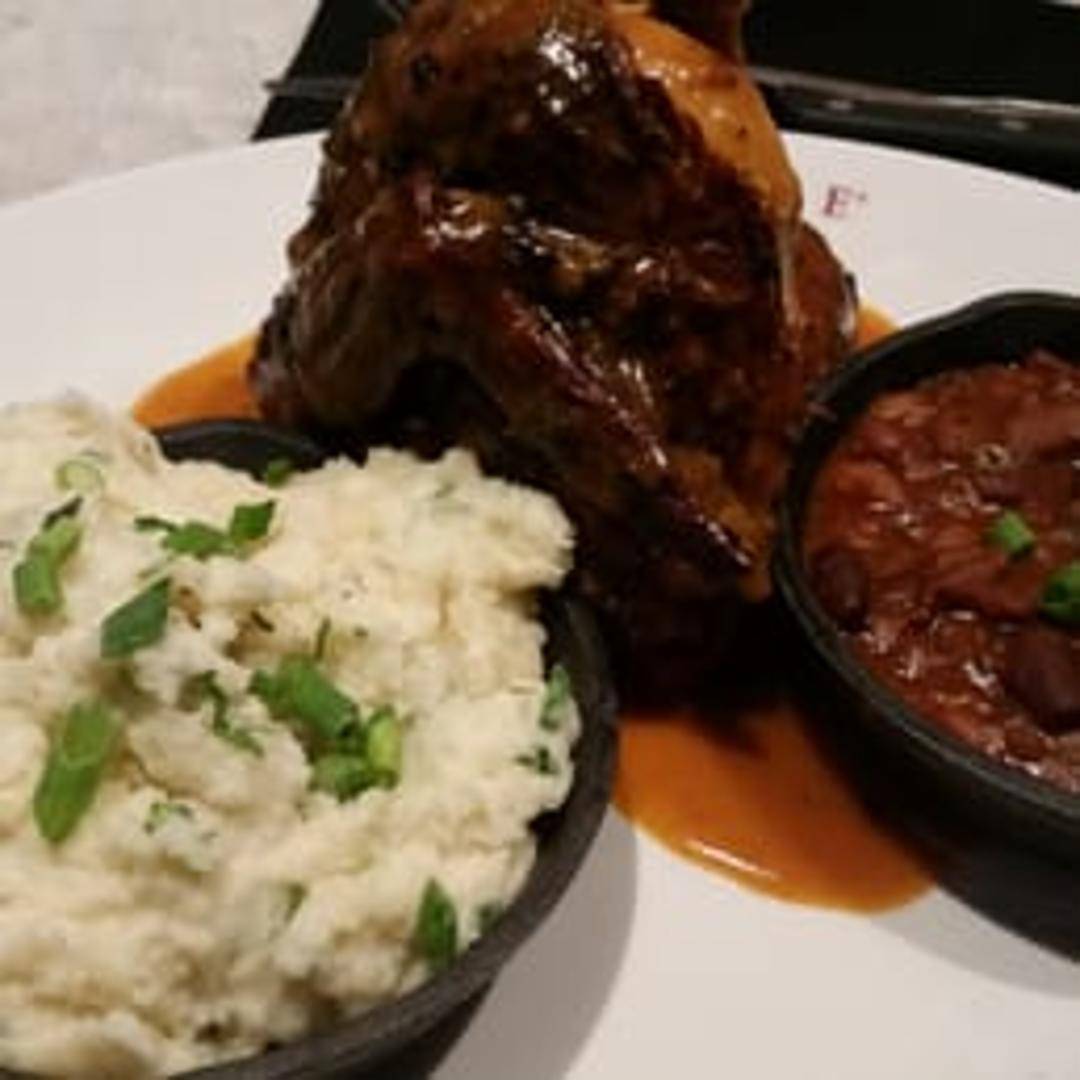 Slow-roasted chicken seasoned with herbs and spices, resulting in moist, flavorful meat. Served with a side.