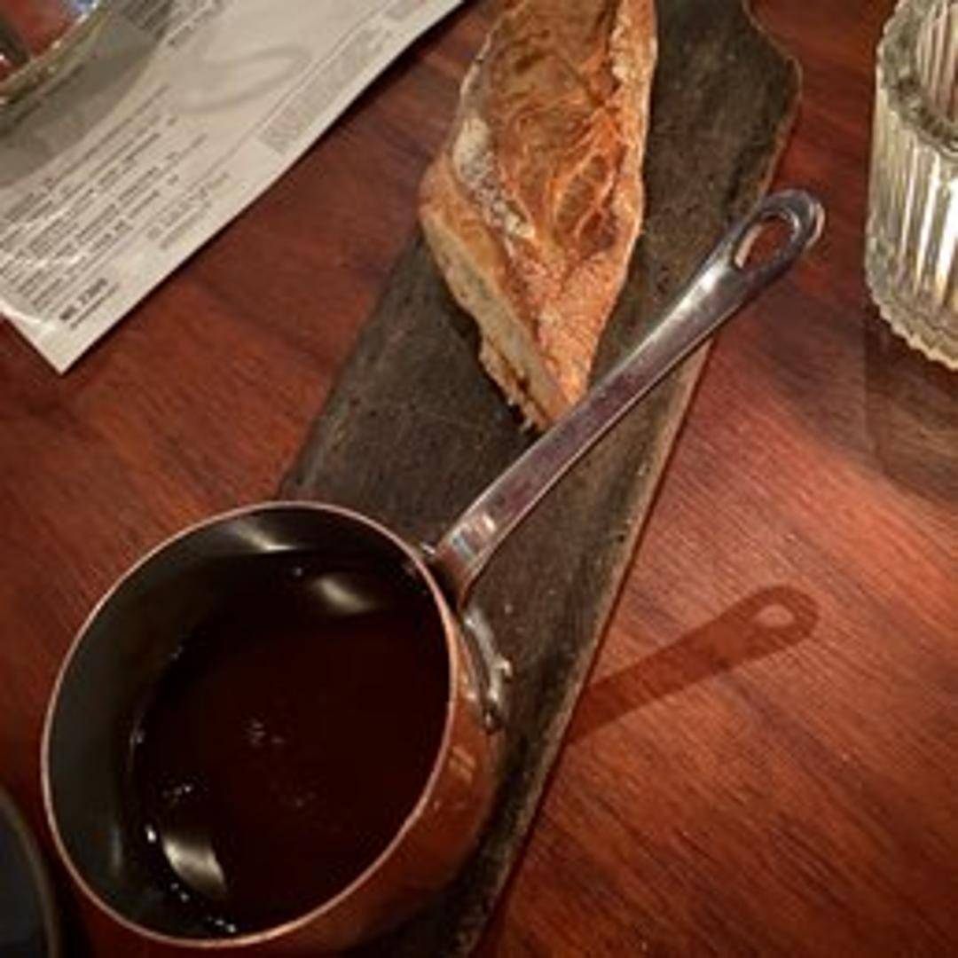 Freshly baked baguette served with a ramekin of flavorful pan drippings, capturing the essence of the kitchen's roasted meats. A savory and comforting starter.