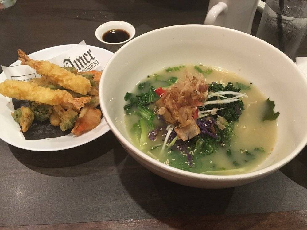 大豆天妇罗拉面 – SOY BEAN TEMPURA LAMEN Miso Broth, Shrimp Tempura, Vegetable Tem-Pura, Seaweed, Scallion