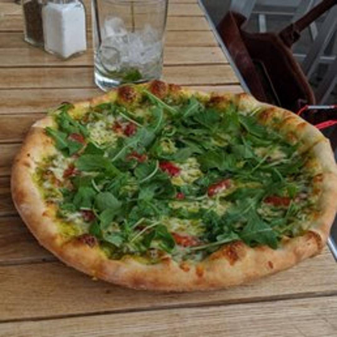A handcrafted pizza featuring a vibrant pesto base, topped with fresh mozzarella, sun-dried tomatoes, and a sprinkle of parmesan cheese. Baked to perfection with a crispy crust.