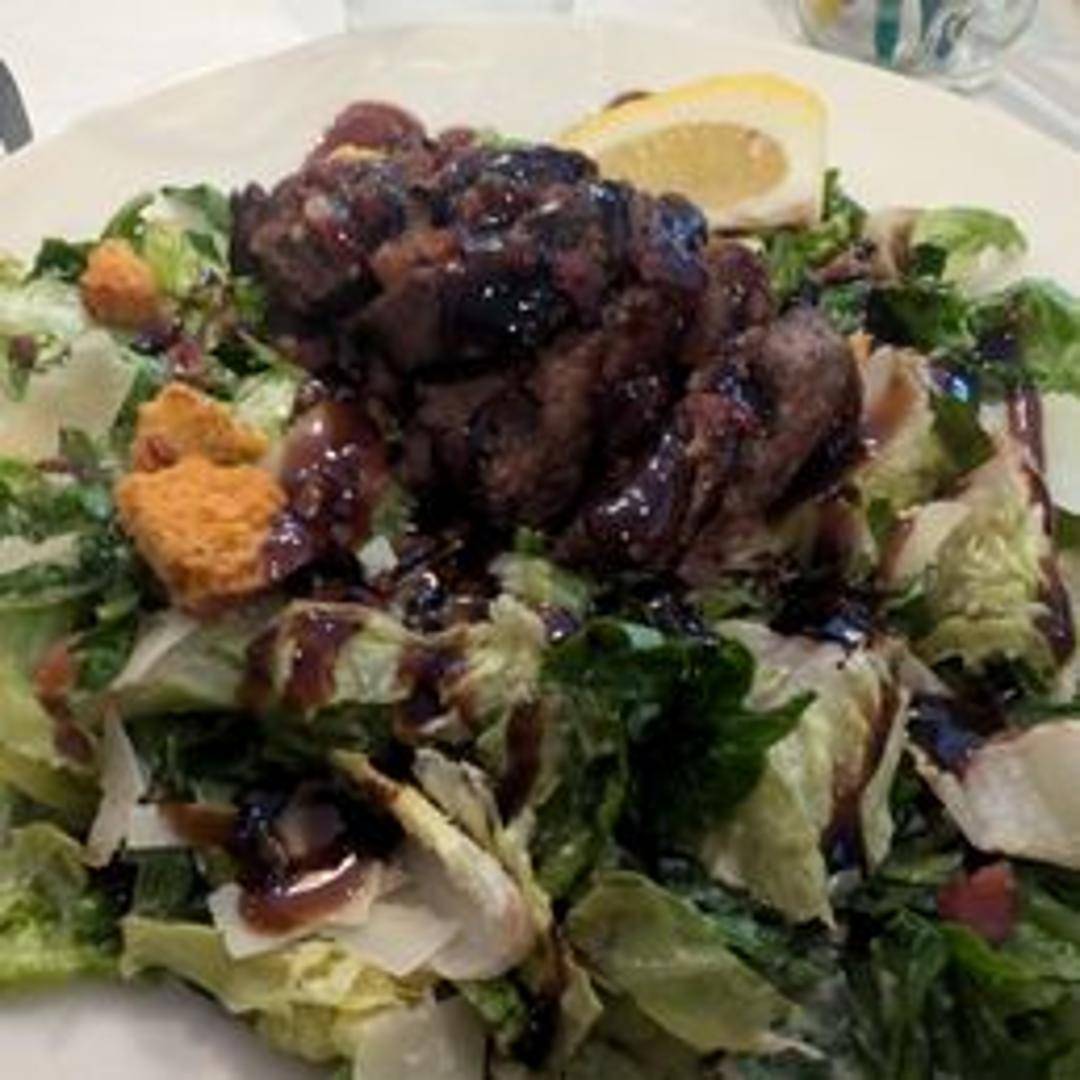 Crisp romaine lettuce tossed in creamy Caesar dressing, topped with grilled steak, parmesan cheese, and croutons.