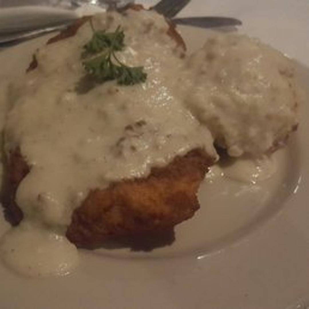A boneless, skinless chicken breast, breaded and fried to a golden crisp, served with cream gravy.
