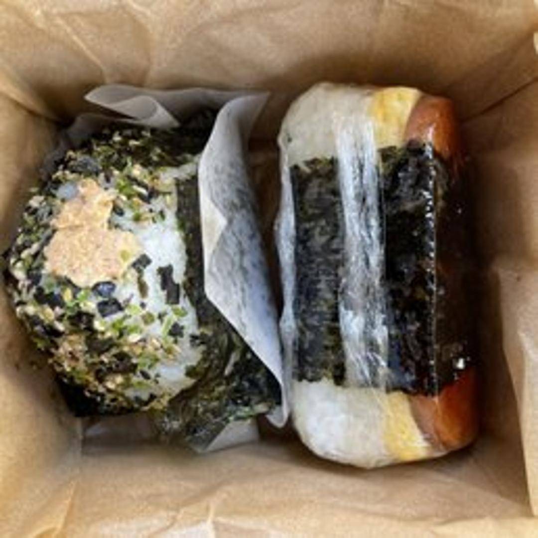 A Hawaiian-inspired onigiri featuring savory Spam and fluffy scrambled egg, tucked inside a bed of perfectly cooked Japanese rice and wrapped in a sheet of nori seaweed. A comforting and flavorful combination.