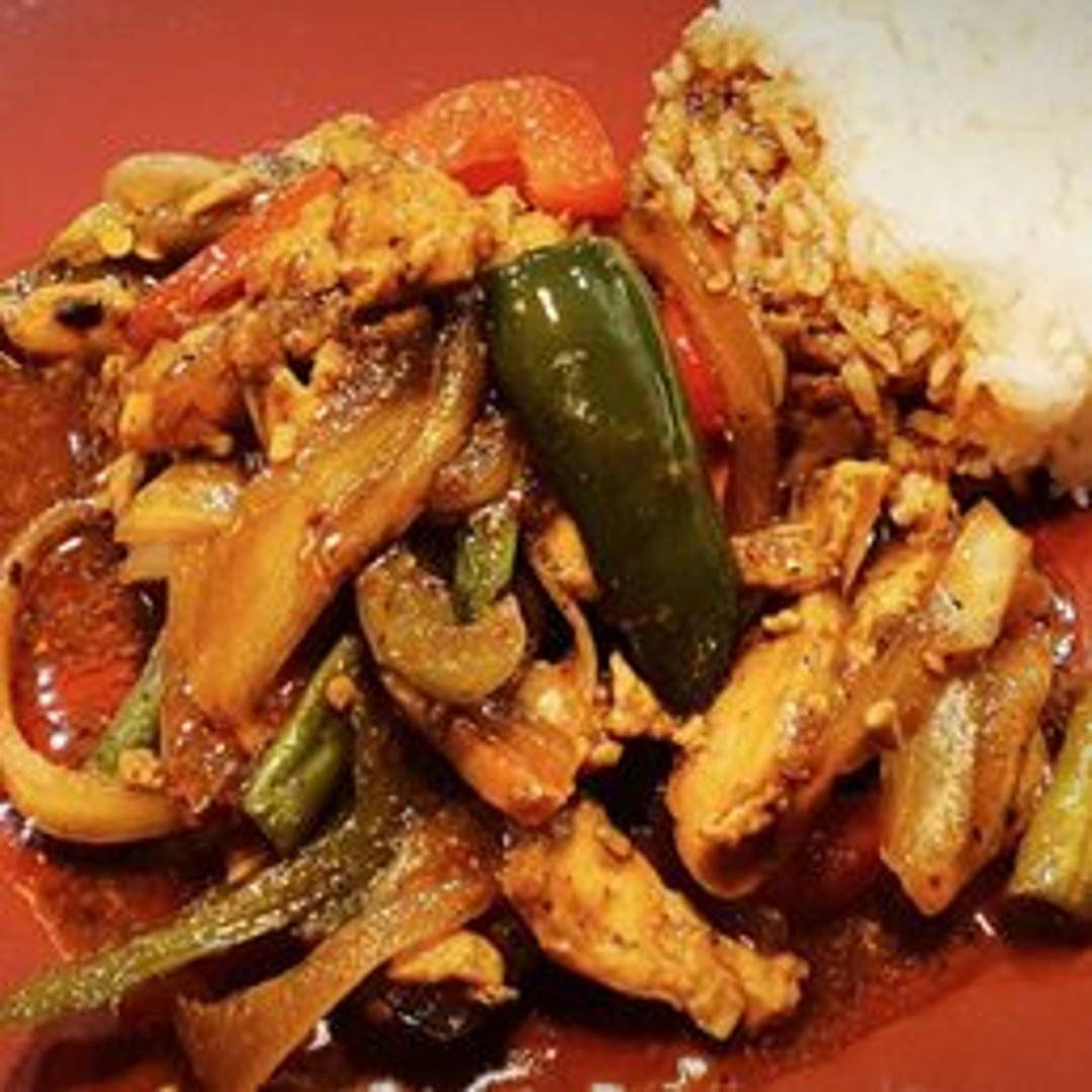 Experience the aromatic depth of this stir-fry, featuring a distinctive roasted chili paste (Prik Pao) that delivers a harmonious blend of savory, subtly sweet, and spicy flavors. Cooked with your choice of protein, bell peppers, and onions, it's a rich and complex dish that awakens the palate.