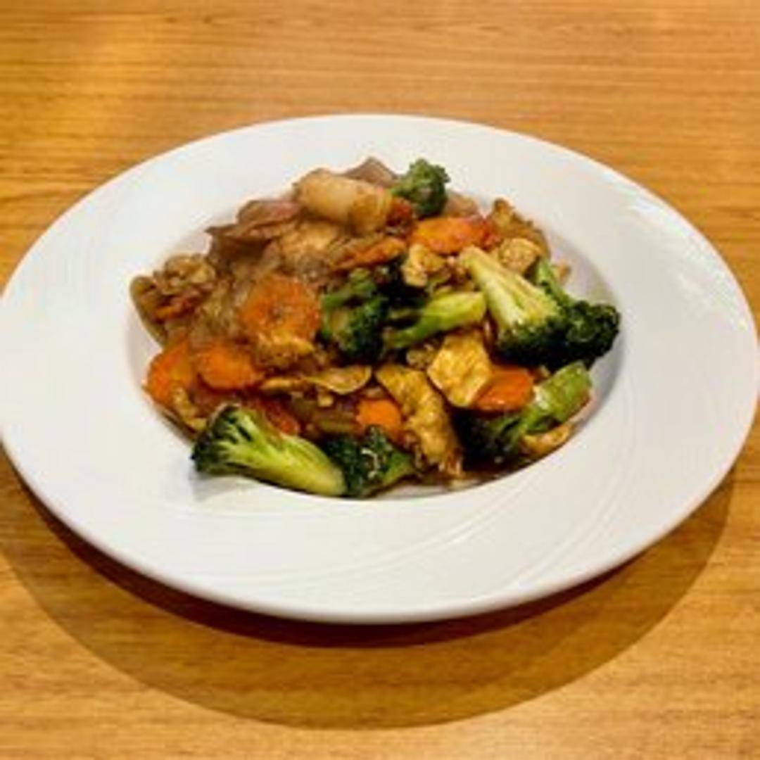 Savor the comforting richness of our Pad See-ew, a classic Thai street food noodle dish. Wide, flat rice noodles are skillfully stir-fried in a searing hot wok with fresh Chinese broccoli and scrambled egg, all enveloped in a savory, slightly sweet dark soy sauce. This beloved dish offers a delightful chewiness from the noodles and a satisfying depth of flavor, making it a perfect hearty meal.