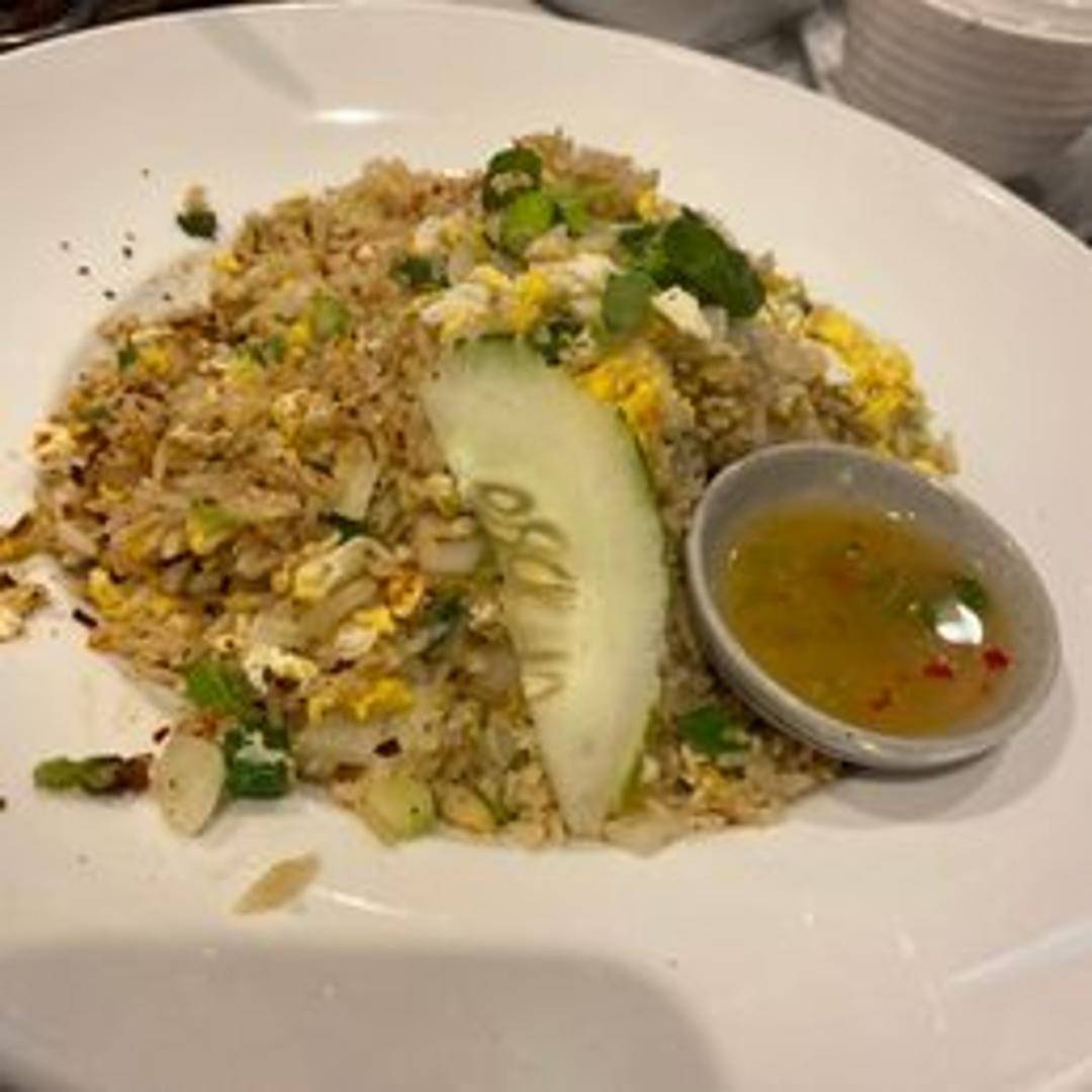 Experience the savory delight of our Crab Fried Rice, a quintessential Thai street food favorite. Fragrant jasmine rice is expertly stir-fried with tender, succulent crab meat, scrambled egg, crisp onions, and a delicate touch of green onions. Each bite offers a harmonious blend of textures and flavors, making for a truly comforting and authentic culinary experience.