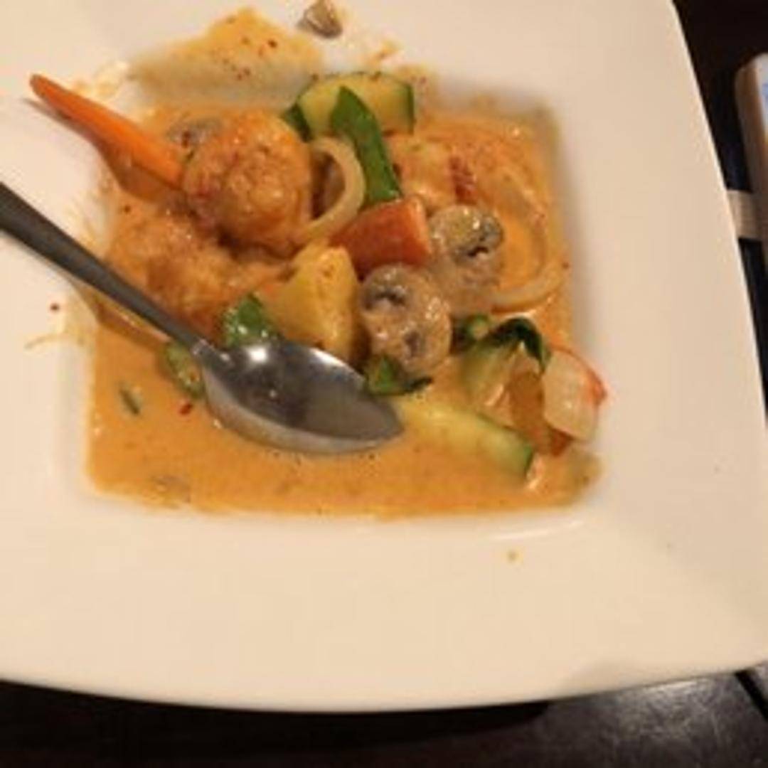 Tender chicken simmered in a rich and fragrant red curry sauce with coconut milk, bamboo shoots, bell peppers, and basil. Served with steamed rice.