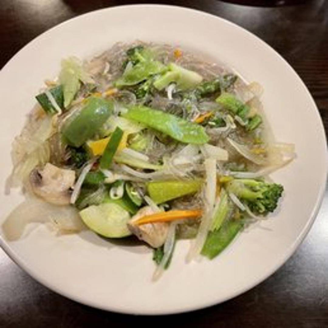 A flavorful dish featuring chewy noodles tossed in a savory Korean-inspired sauce. May contain vegetables, protein (such as beef, chicken, or tofu), and a variety of Korean spices and seasonings. Often includes sesame seeds and green onions.
