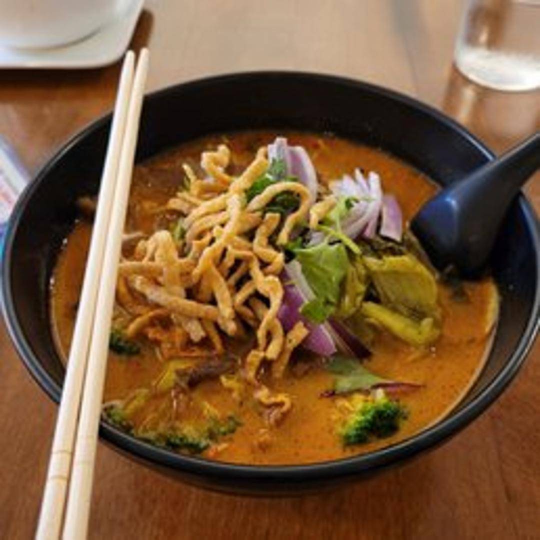 A Northern Thai coconut curry noodle soup with soft egg noodles, your choice of protein (typically chicken or beef), topped with crispy fried noodles, pickled mustard greens, red onion, and lime. A rich and flavorful curry broth.