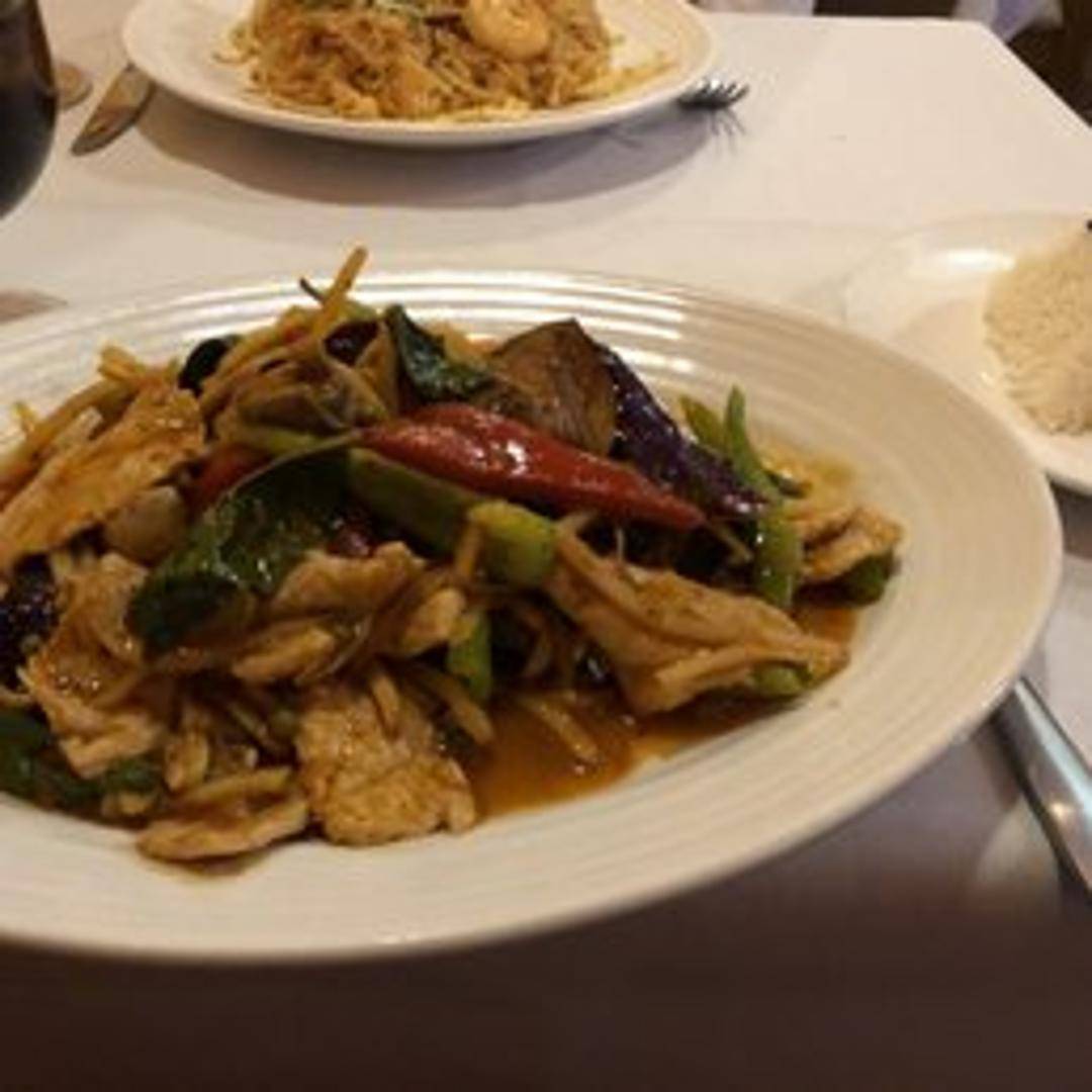 A flavorful and spicy stir-fry featuring tender wild boar meat, fresh Thai basil, onions, bell peppers, and chili peppers in a savory and aromatic sauce. Served with a side of steamed jasmine rice.