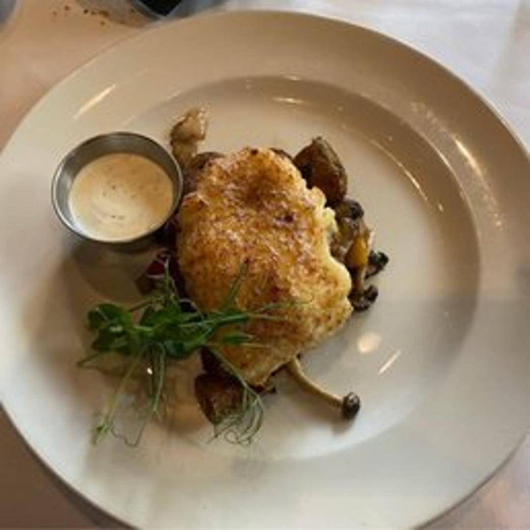 Fresh grouper fillet, pan-seared with a crispy Parmesan crust, served atop a bed of risotto or polenta and accompanied by sauteed spinach or asparagus. May be finished with a lemon butter sauce.