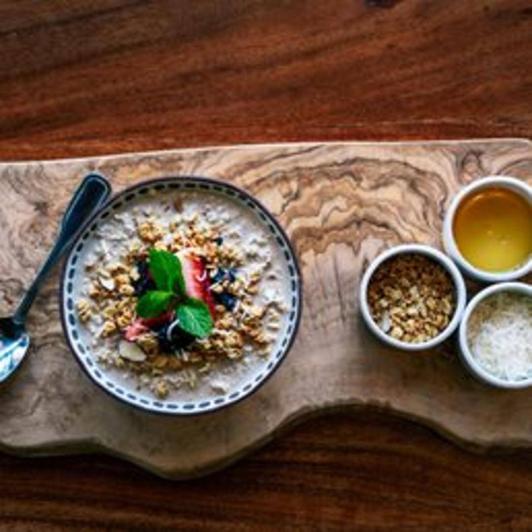 A creamy blend of rolled oats soaked overnight in almond milk with chia seeds, topped with fresh berries, a drizzle of honey, and a sprinkle of granola for added crunch.
