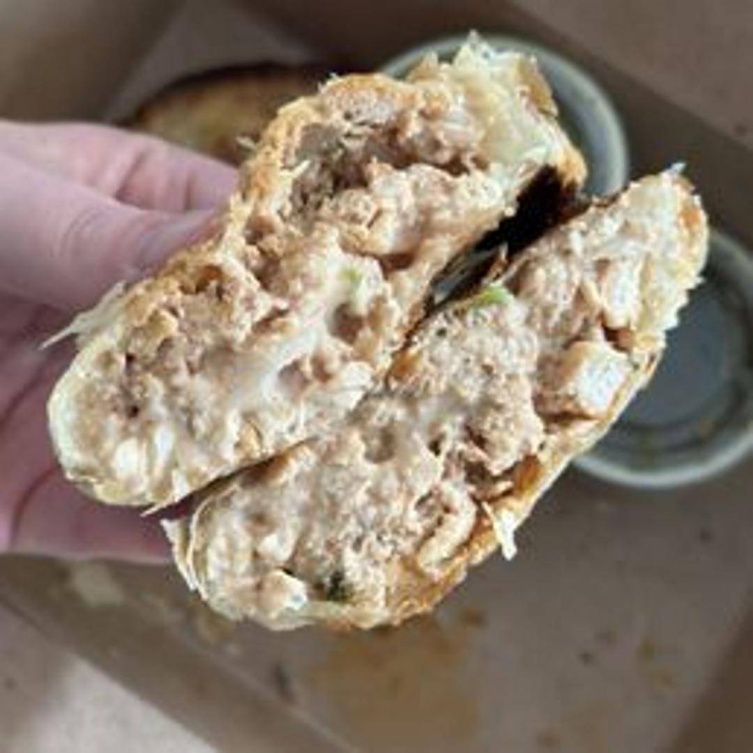 Empanada filled with seasoned shredded chicken in a barbecue sauce.