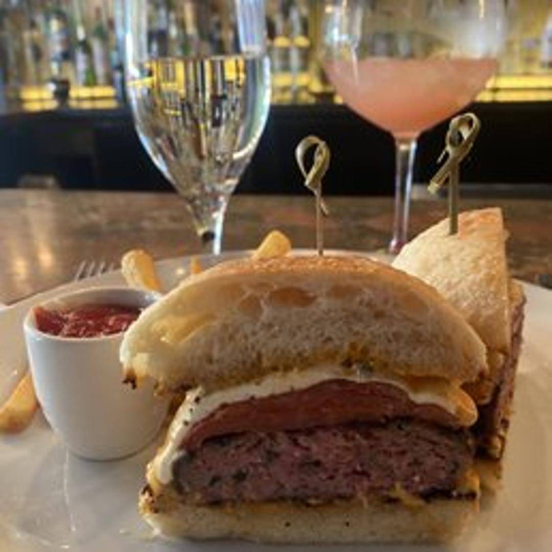 A flavorful lamb burger served on a brioche bun with thoughtfully selected toppings and condiments. A savory and satisfying alternative to a traditional beef burger.
