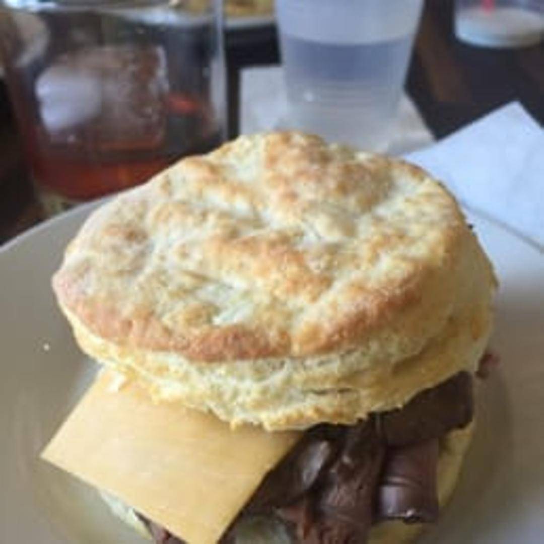 Savory roast beef piled high on a freshly baked Rise & Shine biscuit, often served with a complementary sauce or spread.