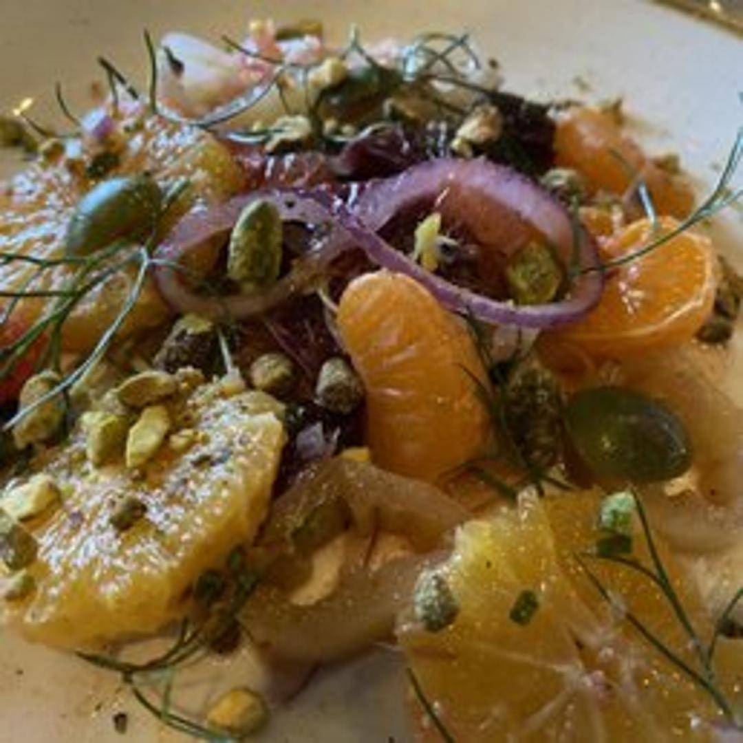 A vibrant and refreshing salad featuring a medley of seasonal Sicilian citrus fruits, such as oranges, grapefruits, and blood oranges, often tossed with slivered almonds, red onion, and a light citrus vinaigrette. May include fresh mint or basil for added aroma and flavor.