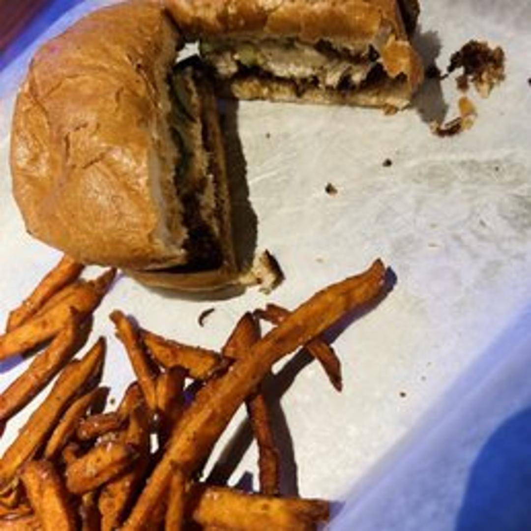 A savory sandwich with grilled or breaded chicken breast, often topped with provolone cheese, roasted red peppers, pesto, and possibly a balsamic glaze or aioli, served on a toasted roll or ciabatta bread.