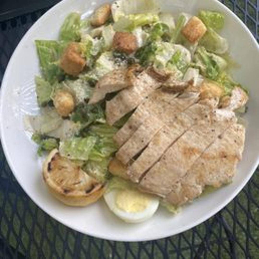 Freshly chopped romaine lettuce tossed in a creamy Caesar dressing with grilled salmon, croutons, parmesan cheese, and cherry tomatoes.