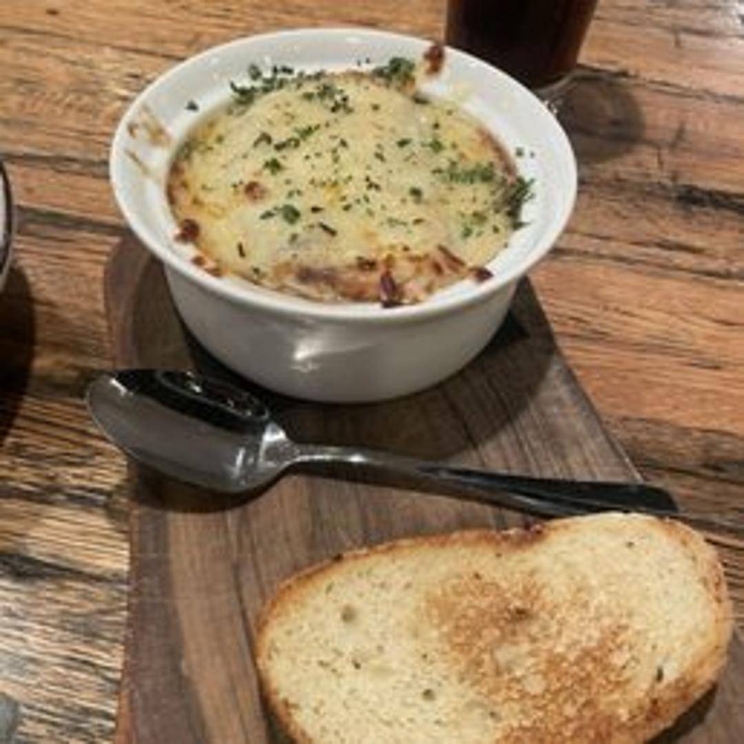 A rich and savory broth simmered with caramelized onions, topped with a toasted crouton and melted Gruyère cheese.
